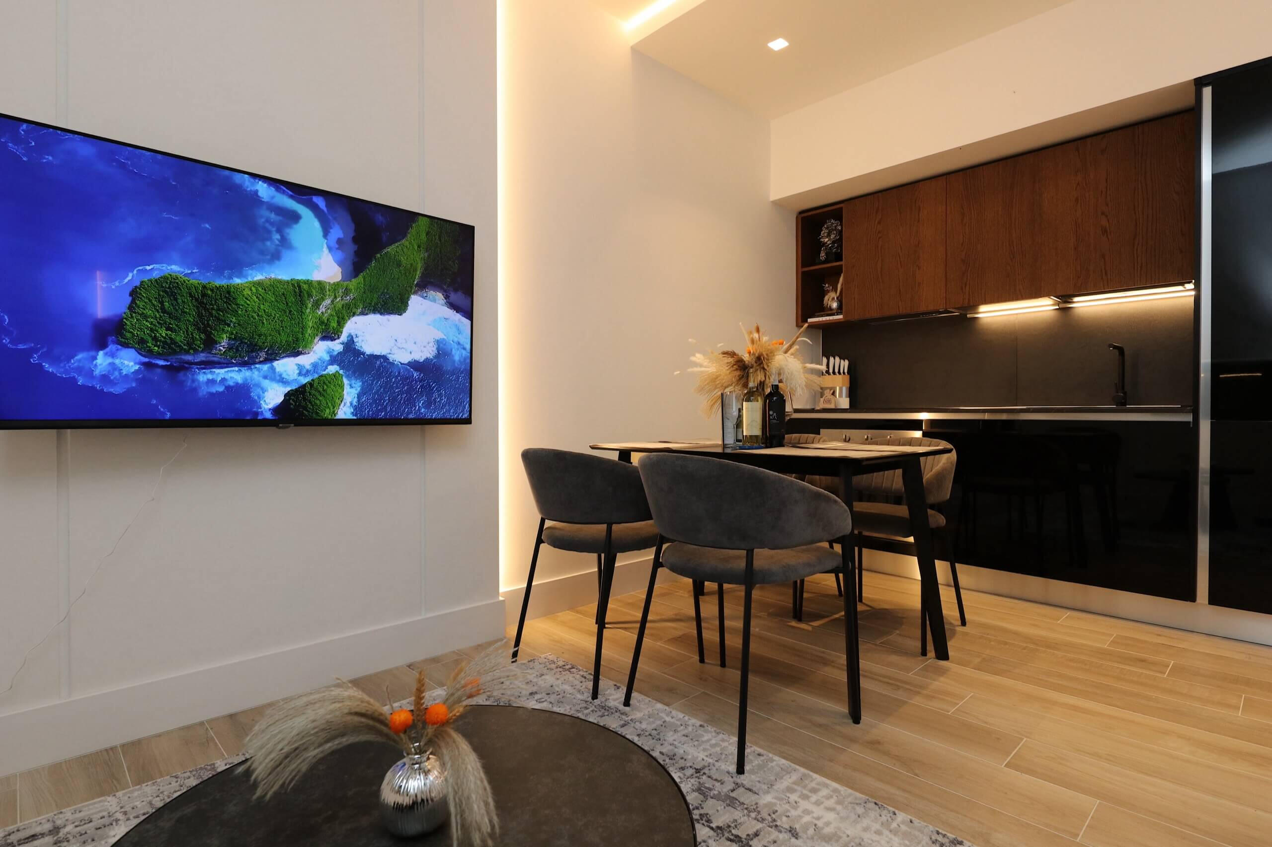 Enjoy the elegance of a custom-designed CREO kitchen for culinary adventures. Relax in the spacious living area, complete with large-screen TVs and ultra-fast Wi-Fi, surrounded by stylish comfort.